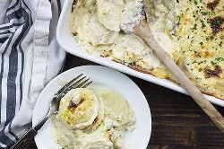 Ya sea que lo llame gratinado de papa con queso o gratinado de papa, estará poniendo la salsa extremadamente cremosa que cubre estas papas.