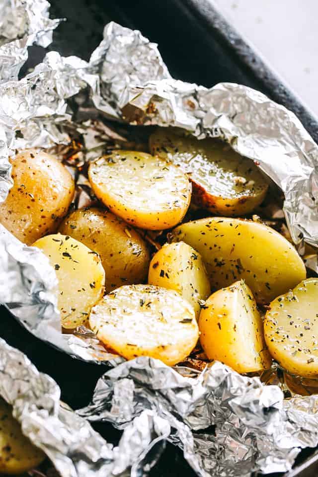 Patatas al horno con hierbas y ajo en papel de aluminio – El ajo, el tomillo y el romero hacen que esta receta de patatas al horno sea tan deliciosa. La parrilla les da la cantidad justa de frescura y un sabor ahumado irresistible.