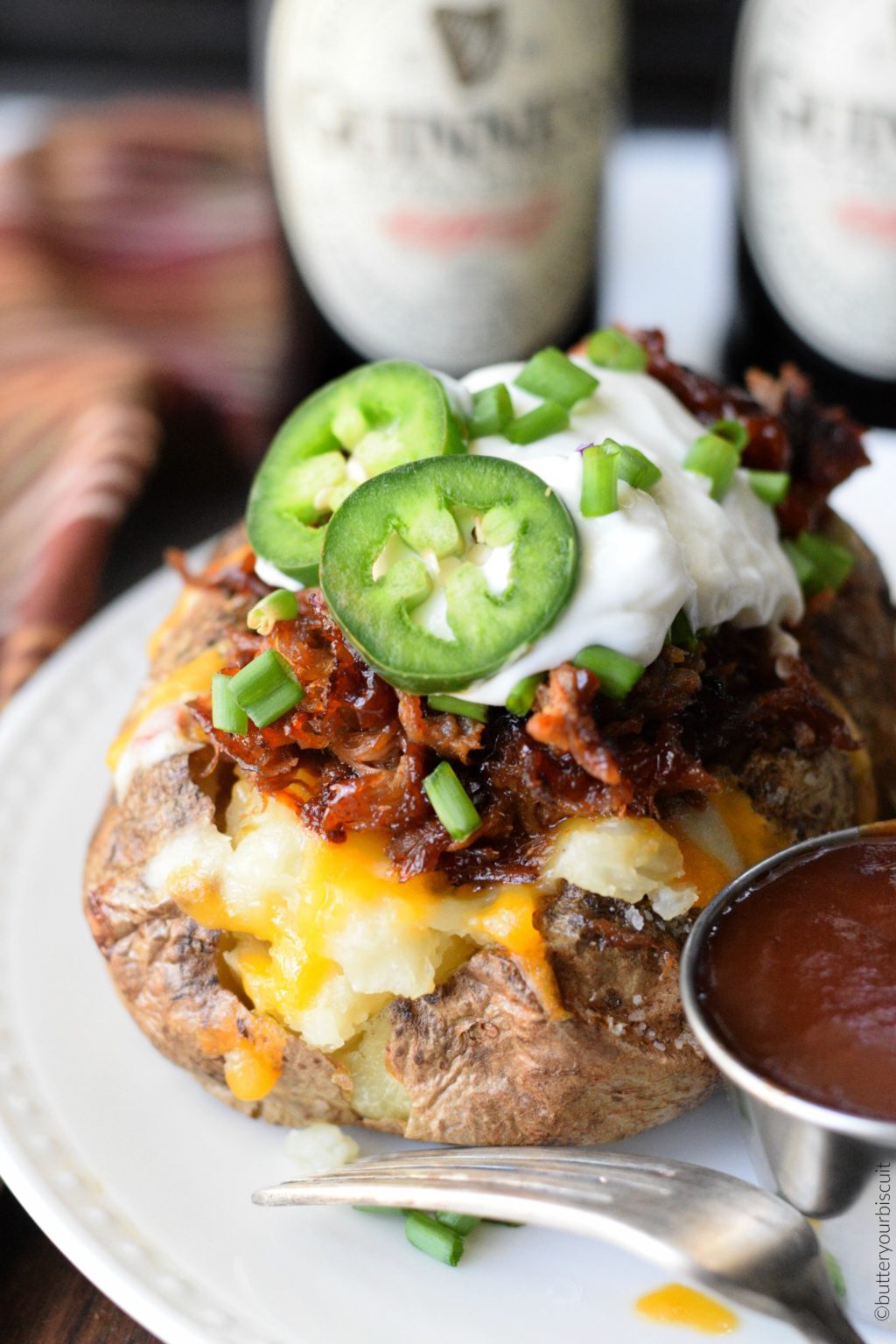 Estas papas asadas cargadas con cerdo desmenuzado están fuera de este mundo. Son lo suficientemente sustanciosos como para ser el plato principal y, junto con la ensalada de col o la ensalada, tiene una comida deliciosa.