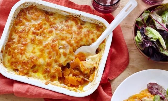 Disponer el camote en un plato preparado, en capas planas, insertado en la mezcla de cebolla y la mitad del gruyère. Estrujar. Verter sobre Massel Liquid Verdure Style. Cubra con papel aluminio y cocine por 1 hora. Retire el papel aluminio y cocine por otros 15 minutos o hasta que esté dorado y tierno.