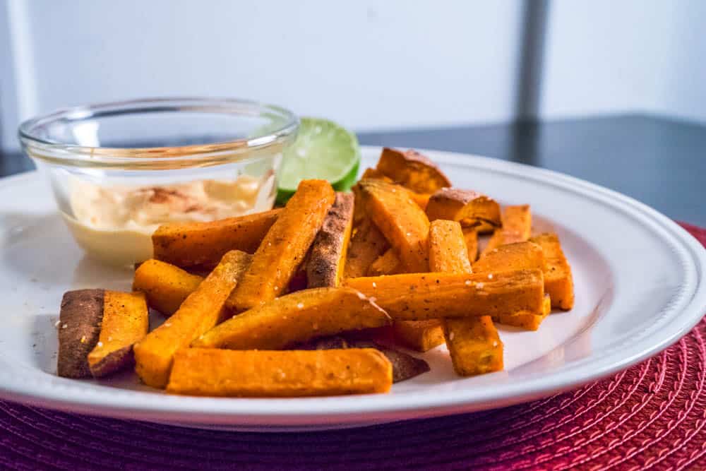 ¡Las batatas fritas están de moda en este momento! Son deliciosamente locos y mucho más saludables que las papas fritas normales. Y le encantarán nuestros dulces chips de paprika servidos con Sriracha Lime Aoili sazonado.