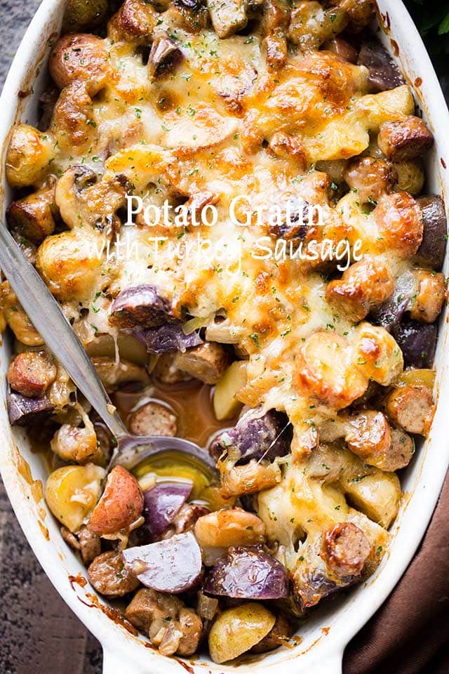 Este queso de patata gratinado con salchicha de pavo y champiñones es un gran acompañamiento para patatas, salchichas de pavo y champiñones. ¡El queso encima se hace cargo!
