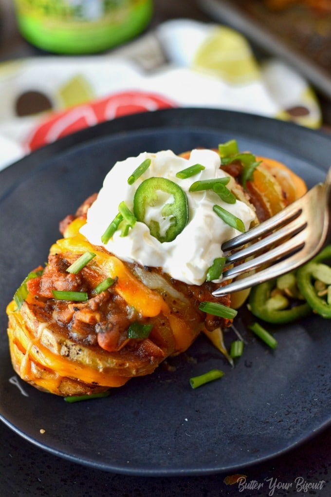 El queso Hasselback y las papas con chile están rellenos con chile, queso derretido y todos sus ingredientes favoritos.