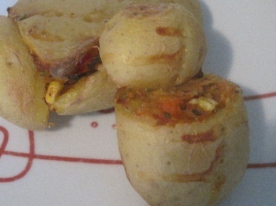 Vierta la mezcla en las papas ahuecadas y vuelva a colocar las tapas.