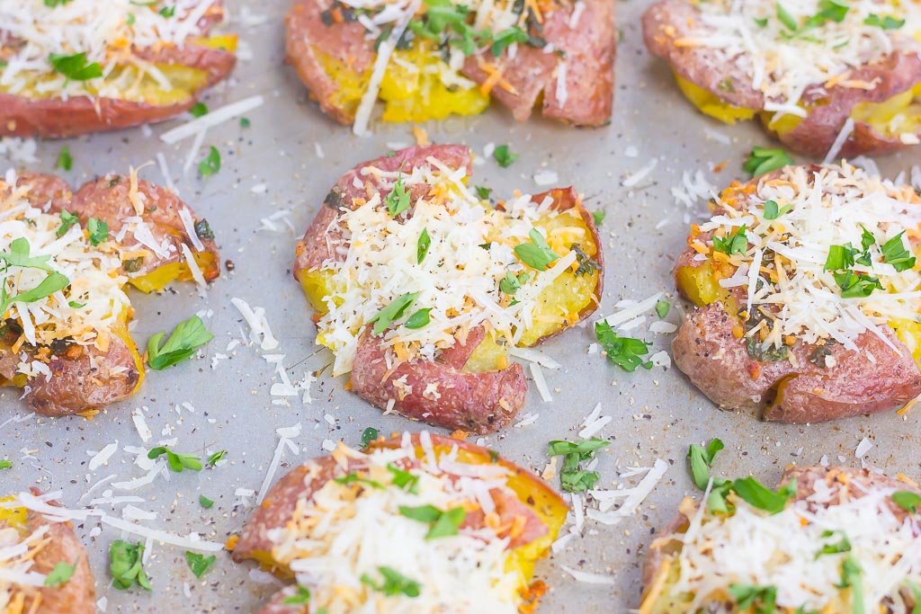 Pero con las papas nuevas no se pelan y eso automáticamente me hace feliz. Asarlos a la perfección (como estos Patatas Asadas Con Hierbas) o en este caso, ¡aplastarlos!