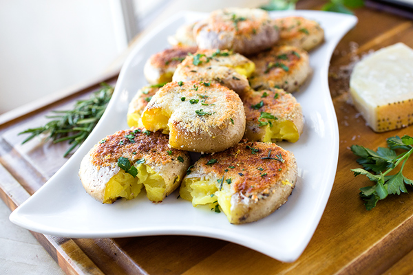 Ligeramente crujientes y doradas, estas papas partidas son un plato de papa deliciosamente divertido y sabroso. Rociadas con aceite de oliva, ajo, romero fresco y perejil, además de una generosa pizca de queso parmesano como un sabroso final, ¡estas deliciosas papas le dan un gran toque a las clásicas papas al horno!