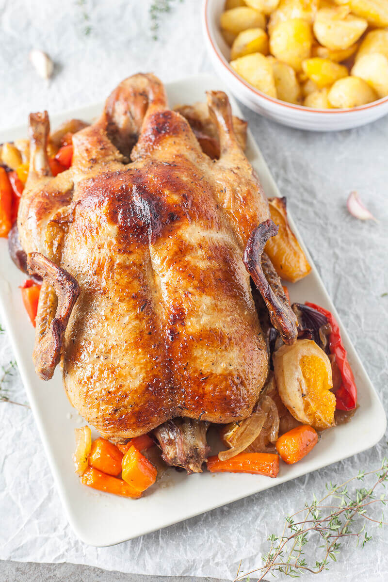 El pato asado con verduras es la celebración perfecta del otoño. Con una piel crujiente y una carne deliciosa y jugosa, es un excelente asado para el Día de Acción de Gracias.