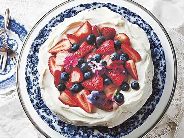 Usando un batidor de globo, bata la crema en un tazón grande hasta que se formen picos suaves. Cubra la pavlova con crema batida, fresas y arándanos. Decorar con flores comestibles.