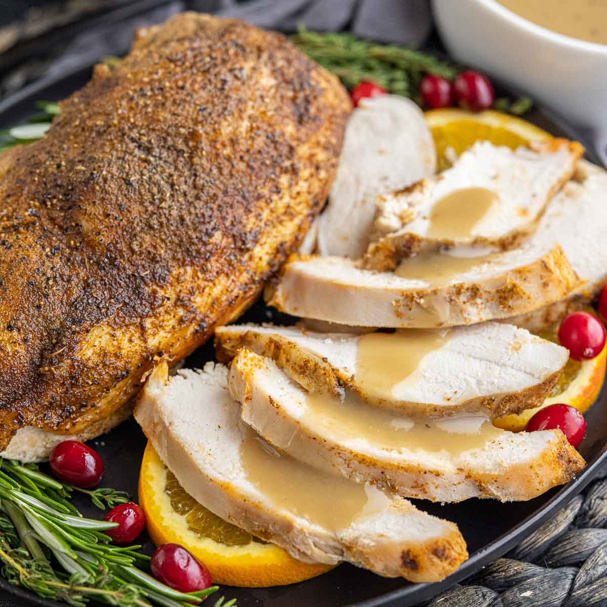 No te vamos a mentir, nunca obtendrás esa piel tan delicada y completamente crocante que obtendrías horneando durante horas. Pero podemos prometer que cuando muerdas esta pechuga de pavo perfectamente tierna que no tuviste que rociar y estirar durante horas, ¡no te importará!
