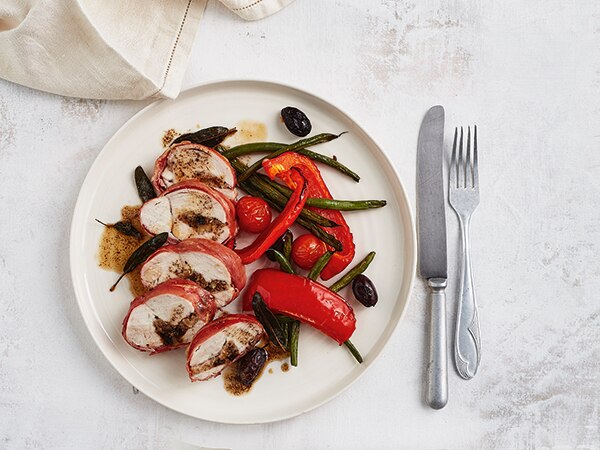 Las verduras mediterráneas asadas son deliciosas y se sirven con pollo.