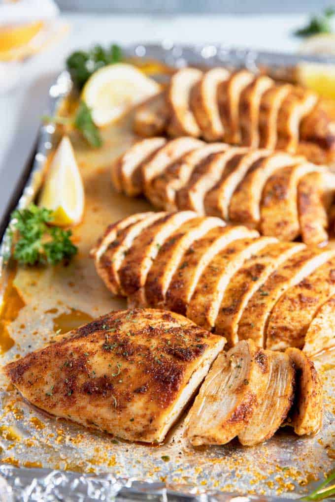 La pechuga de pollo asada es una de esas recetas que hago todo el tiempo. La pechuga de pollo asada se prepara rápidamente en una sola bandeja para hornear y se puede personalizar fácilmente a su gusto. Además, si eres como yo, ¡siempre estás buscando recetas fáciles de pechuga de pollo! Si eres más amante de la carne oscura, prueba estos sencillos. muslos de pollo asado!