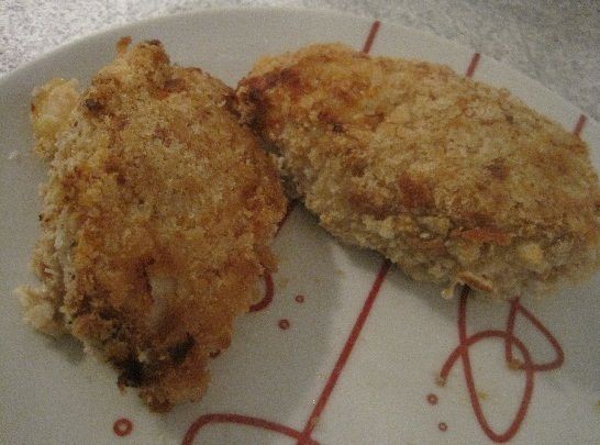 Desmenuzar el pollo con la harina, pasarlo por el huevo batido y cubrirlo con el pan rallado.