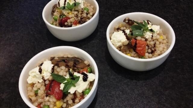 Picar la berenjena, los pimientos y los tomates secados al sol y mezclar suavemente en un bol grande con los guisantes, el maíz, el vinagre balsámico y el cuscús.