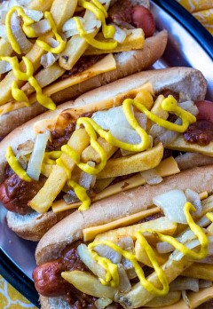 Comienza con un hot dog recién tostado colocado en un panecillo forrado con una rebanada de queso americano. Luego viene cubierto con un delicioso perrito caliente con chili (o puede hacerlo sabroso Chili de Cincinnati si quieres hacerlo más casero), unas patatas fritas crujientes, cebollas asadas y un chorrito de mostaza.
