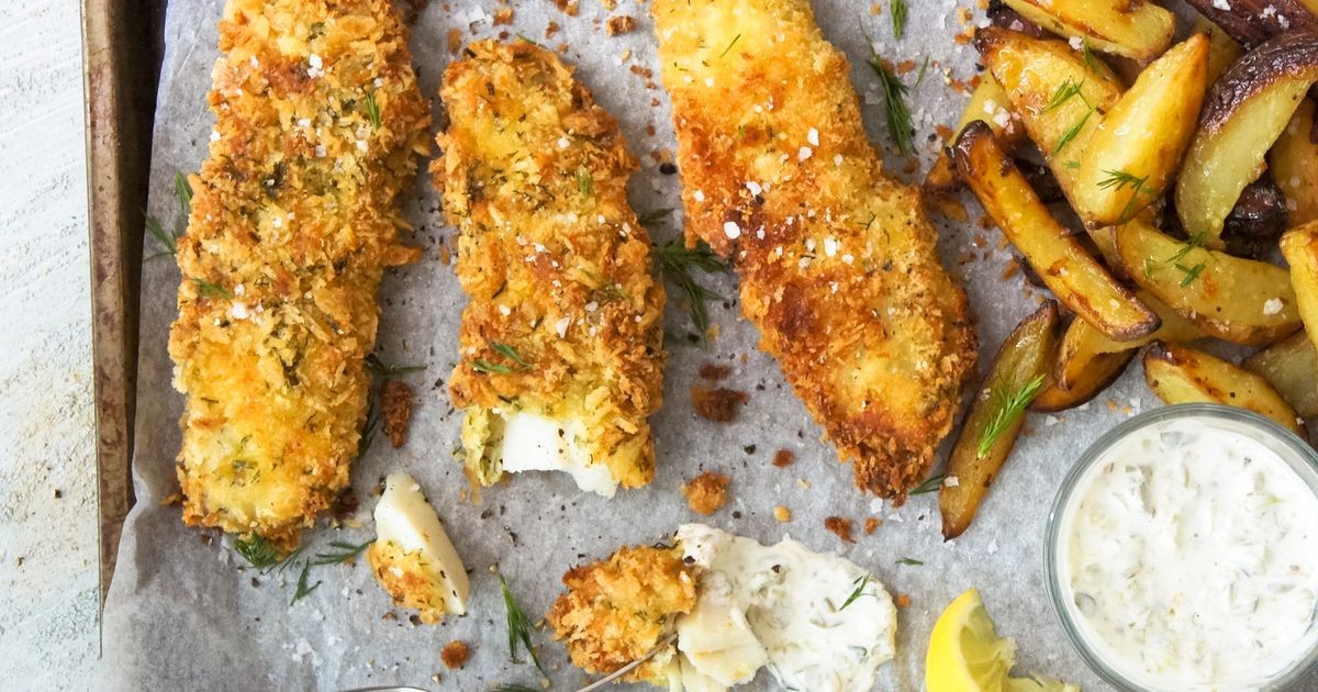 Sumerja el pescado en la clara de huevo y agregue la mezcla de migas.