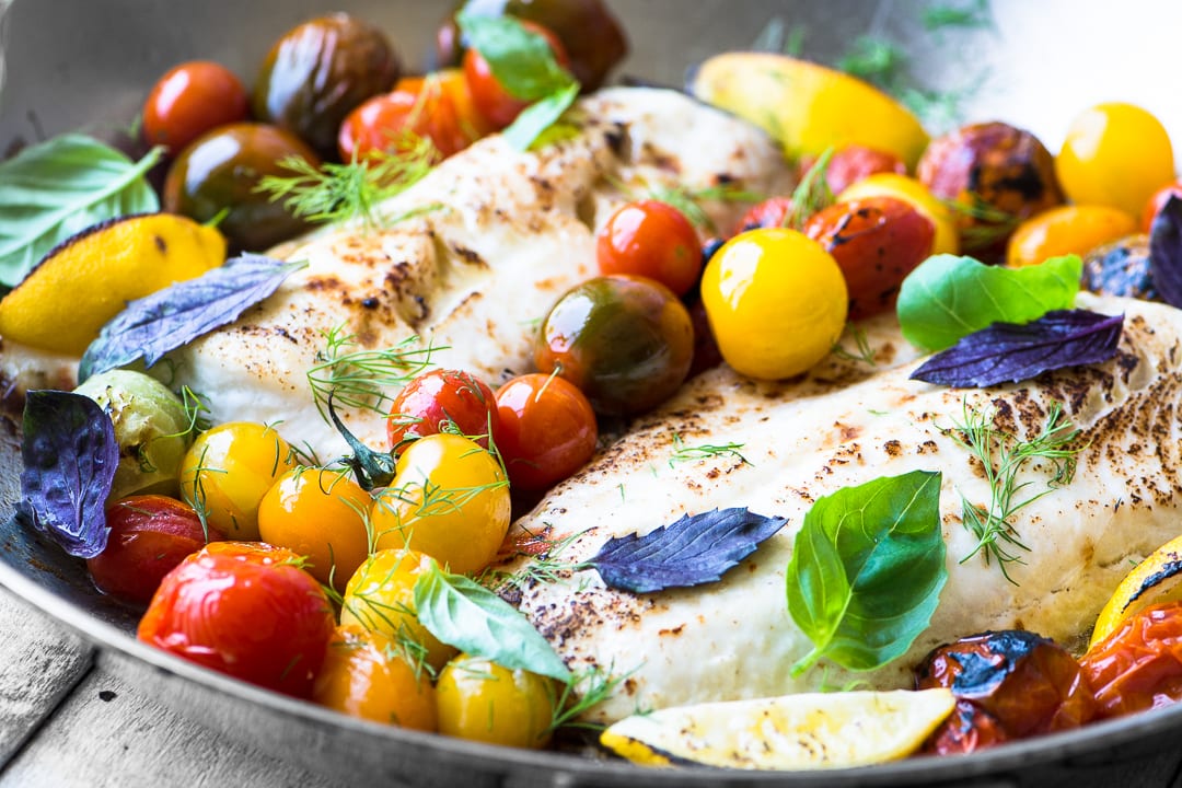Nota: si lo deseas, puedes preparar los tomates por separado en la estufa en una sartén, revuélvelos durante unos minutos a fuego medio-alto hasta que comiencen a explotar. Luego agregue al pescado antes de servir.
