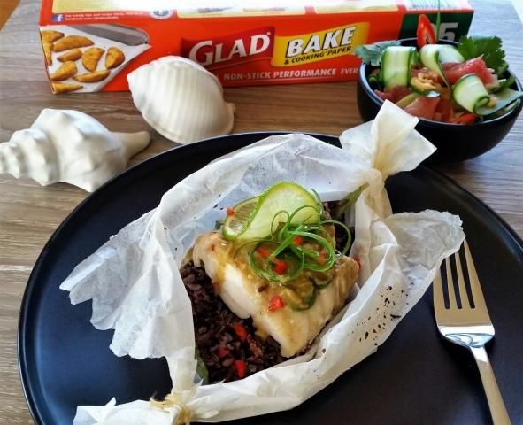 Precalentar el horno a 180°C (ventilación forzada 160°C). Cortar 4 rectángulos GLAD Bake lo suficientemente grandes para contener los filetes de pescado con otros para doblar y sellar los bombones.