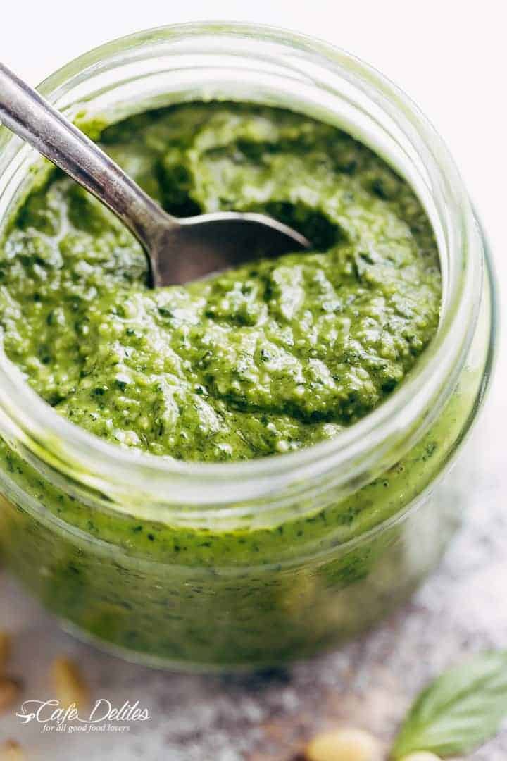 El pesto se puede cubrir con cualquiera de sus comidas saladas favoritas para darle un toque fresco y agradable. Mejor que cualquier pesto comprado en la tienda, con un delicioso ponche con solo 5 ingredientes y un procesador de alimentos.