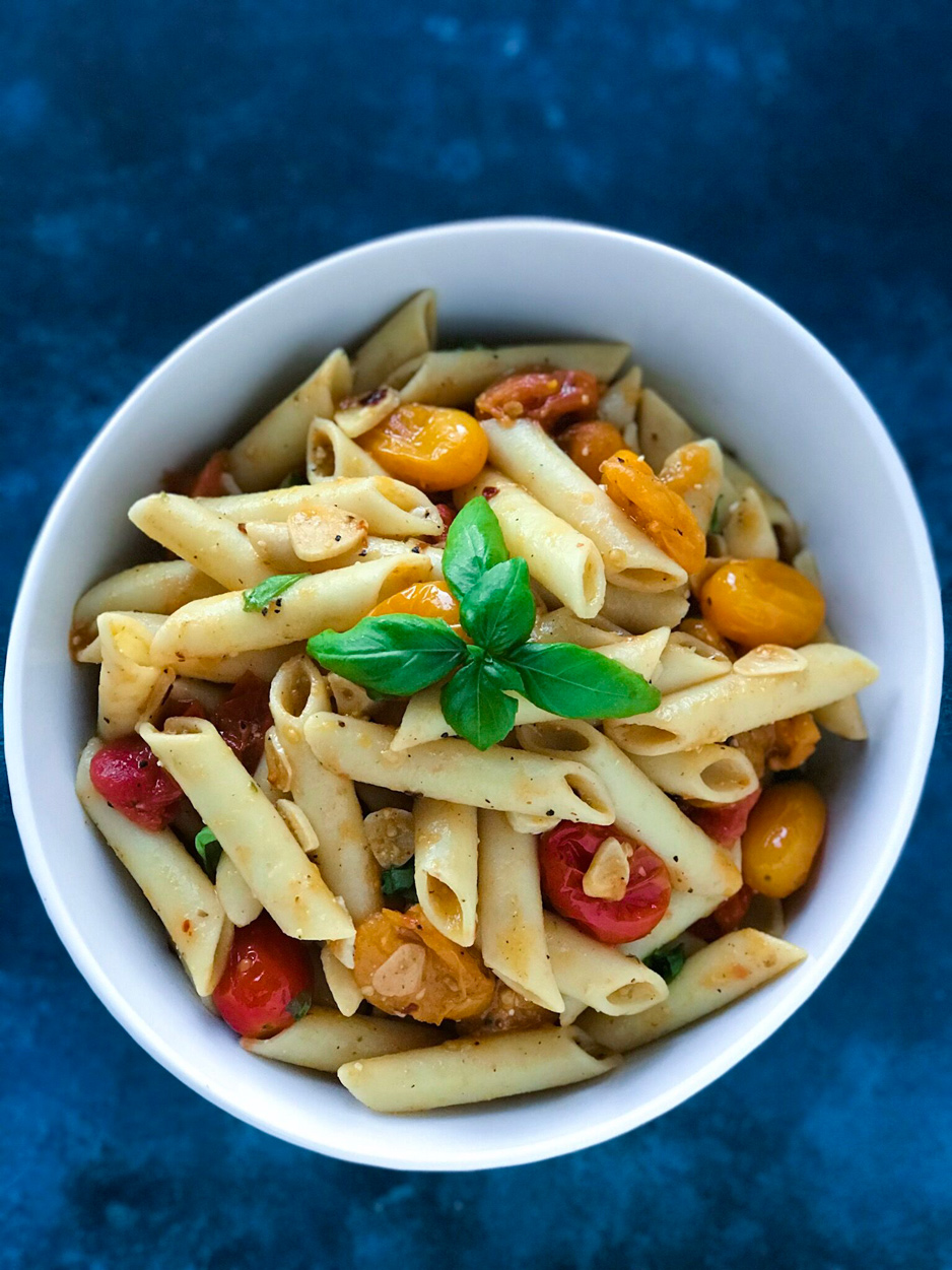 Una receta de pasta sencilla que se puede comer caliente o fría y es perfecta para las loncheras. Curso: Pasta Palabra clave: Pasta simple Tometo Pesto Tiempo de preparación: 10 minutos Tiempo de cocción: 20 minutos Tiempo total: 30 minutos Porciones: 4 Calorías: 367kcal