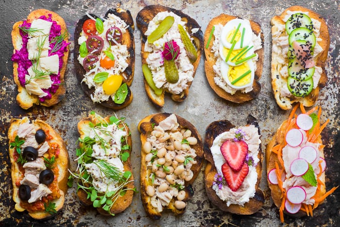 Mi fórmula para estos picatostes es simple: primero pongo una capa base, que debe ser algo con un poco de humedad para ayudar a que se adhiera al pan. La segunda capa podría tener una textura “más gruesa” y terminé con un delineador de color. Para algunos de mis picatostes, puse el atún directamente de la lata en el pan… está empacado en aceite de oliva puro que ayuda a humedecer el pan y agregar sabor, ¡así que no lo desperdicies! Para otros, hice una ensalada rápida de atún con mayonesa, mostaza integral y la usé como base. Puedes usar tu receta favorita de ensalada de atún. Si no sabes qué combinar con qué, trata de seguir un tema para que sepas que los sabores se complementan entre sí… el primero está hecho con atún blanco cubierto con frijoles blancos, aceite de oliva y tomillo fresco para un ambiente francés. . Puedes hacer una versión italiana con aceitunas y pimientos rojos o una versión japonesa con pepino y jengibre encurtido. ¡El atún es sorprendentemente versátil!