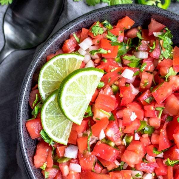 Pico de Gallo, también conocida como Salsa Fresca, es una salsa de tomate fresca rellena de tomates maduros al sol, cebollas crujientes, ajo fragante y cilantro y un poco de limón. Es una receta de salsa brillante y fresca que combina perfectamente con cualquier comida.