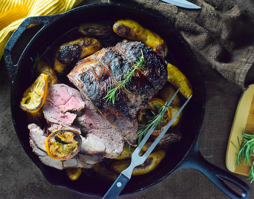 Pierna de cordero deshuesada asada con romero y limón