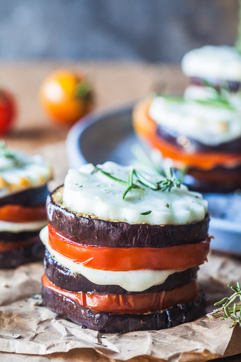 Berenjena y tomate Caprese Stacks es una deliciosa cena vegetariana baja en carbohidratos y sin gluten, ¡perfecta para el entretenimiento en una noche de verano!