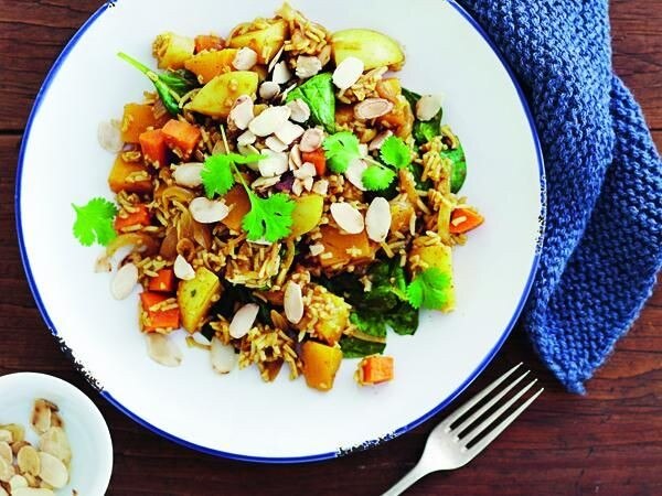 Agrega las espinacas. Condimentar con sal y pimienta. Servir espolvoreado con almendras y cilantro.