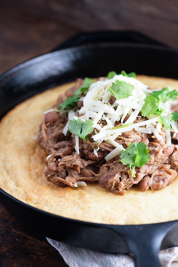 De todos modos, obtuve esta receta del sitio web de Hurst y estoy bastante enamorado de ella. Como puede ver, serví este cerdo y frijoles en pan de maíz aquí, pero también lo comemos en tortillas como nachos y en un tazón de burrito. De hecho, podría comerlo solo con un poco de mi salsa de chile favorita.