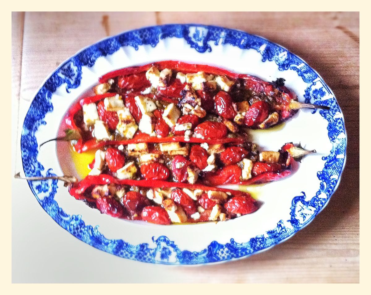 SUSTITUCIONES Lo hice con pimientos verdes puntiagudos que resultaron bien a pesar de no gustarme el sabor de los pimientos en general. Se pueden sazonar con queso parmesano rallado en lugar de queso feta. Agregar unas rodajas de filetes de anchoa y aceitunas negras sería bastante delicioso.