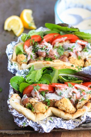 Con estas pitas de coliflor horneadas, usé papas pequeñas de piel roja en lugar de las papas amarillas tradicionales y las serví en un pan naan de ajo más espeso que nuestras pitas delgadas tradicionales. También agregué muchas verduras adicionales para condimentar el plato con un sabor más fresco. Y lo que lo une todo: ¡ese chorrito de salsa de ajo, limón y tahini!