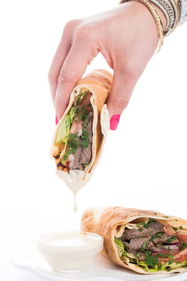 Una receta tradicional de sándwich libanés, el shawarma de res se envuelve en una pita con tahini cremoso y salsa de ajo.