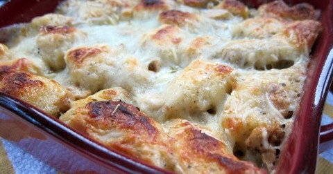 Precalentar el horno a 375 grados. Corta las galletas en cuatro y colócalas en un tazón mediano. Mezcla las galletas con la salsa alfredo y el ajo en polvo. Agregue el pollo y los champiñones (o camarones) y la mitad del queso. Revuelva hasta que esté bien mezclado. Rocíe una sartén de 9 × 13 con aceite en aerosol. Vierta la mezcla de galletas en la sartén y agregue el queso restante. Hornee a 375 durante 25-30 minutos o hasta que las galletas estén listas.