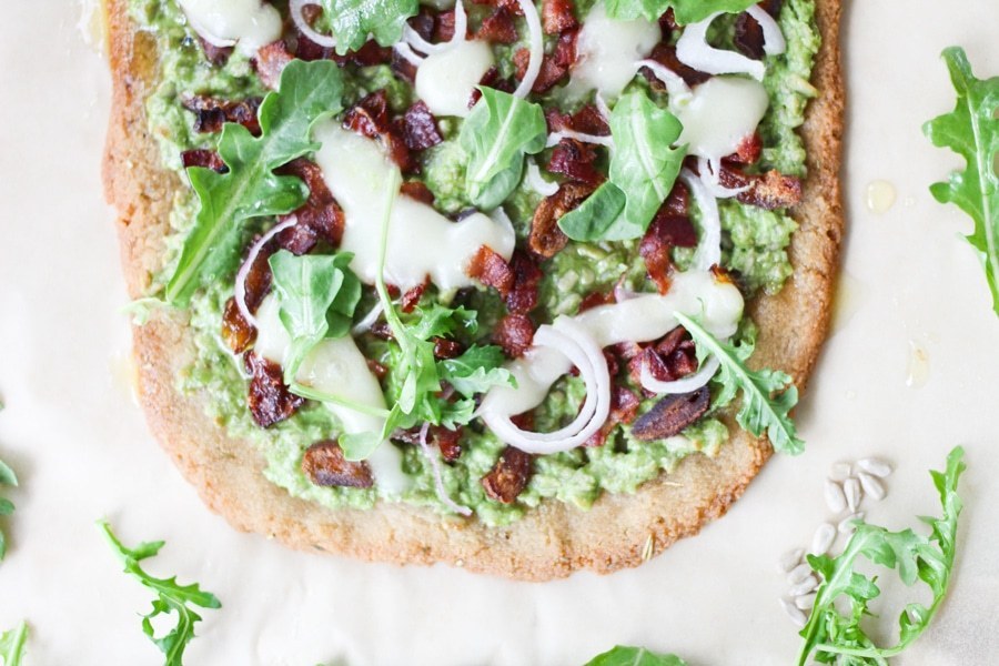 Pizza de albaricoque y tocino con pesto de crema de primavera y vinagreta de miel de champán: ¡una deliciosa focaccia sin paleo, sin granos, sin lácteos y sin gluten (opción AIP) deliciosa llena de sabor!
