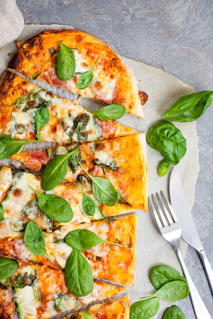 Esta deliciosa pizza de harina de espelta con espinacas y calabacín está elaborada con harina de espelta, jamón, calabacín y espinacas para una opción de pizza más saludable.