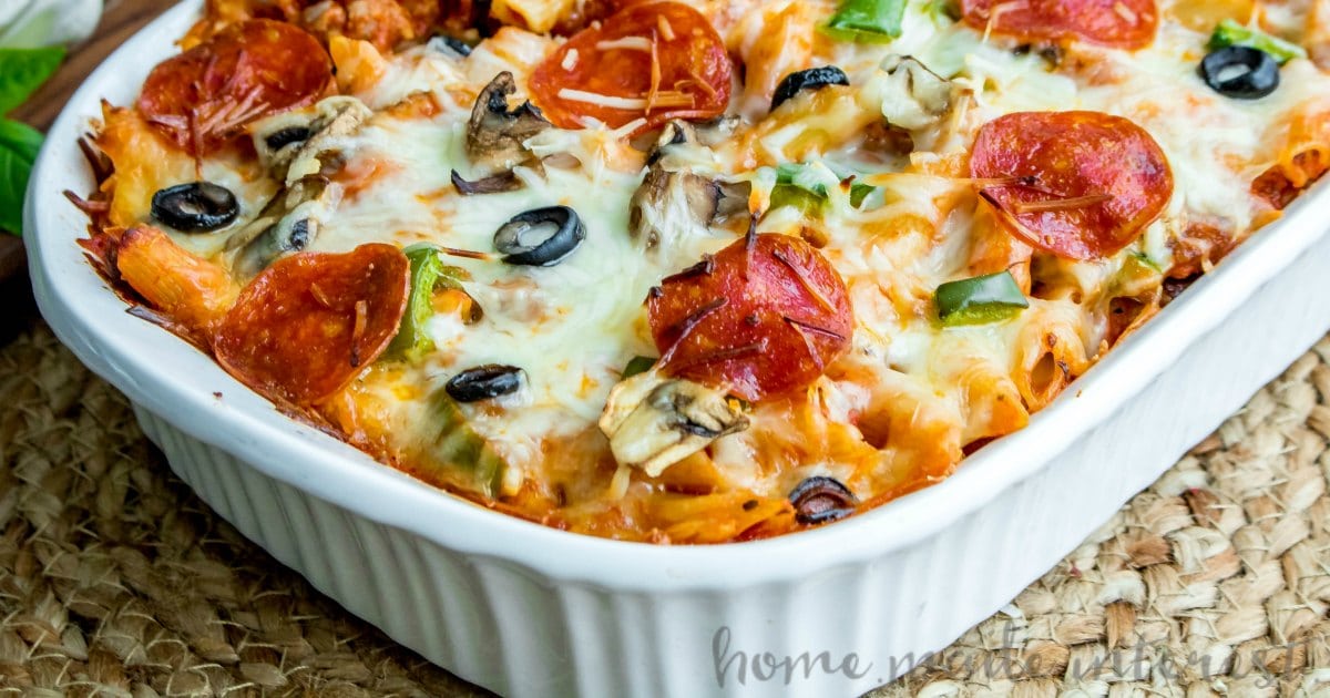 Esta sencilla receta de pizza a la cazuela es una masa de pizza sencilla hecha con penne, salsa de tomate, mozzarella y todos nuestros ingredientes favoritos para pizza.