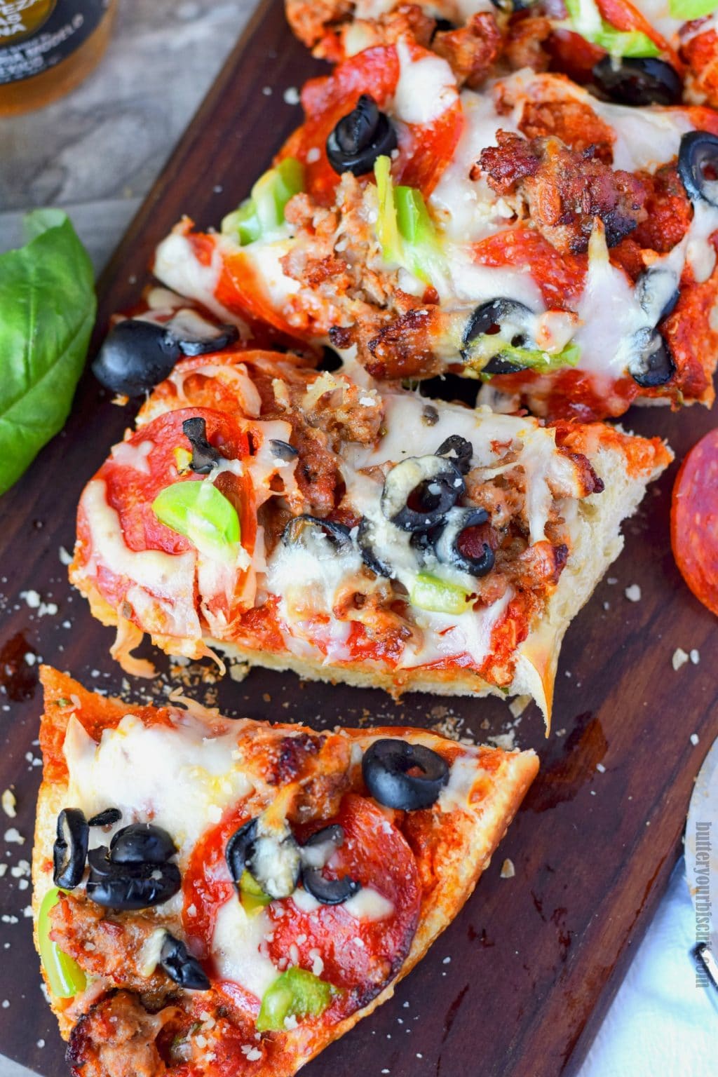 La pizza de pan francés es mucho más fácil de preparar que la pizza normal. ¿Por qué intentar hacer tu propia pasta cuando puedes prepararla en unos 30 minutos con una ensalada crujiente y hacer una gran comida? También son una comida perfecta para congelar temprano o asar a la parrilla en el campamento.