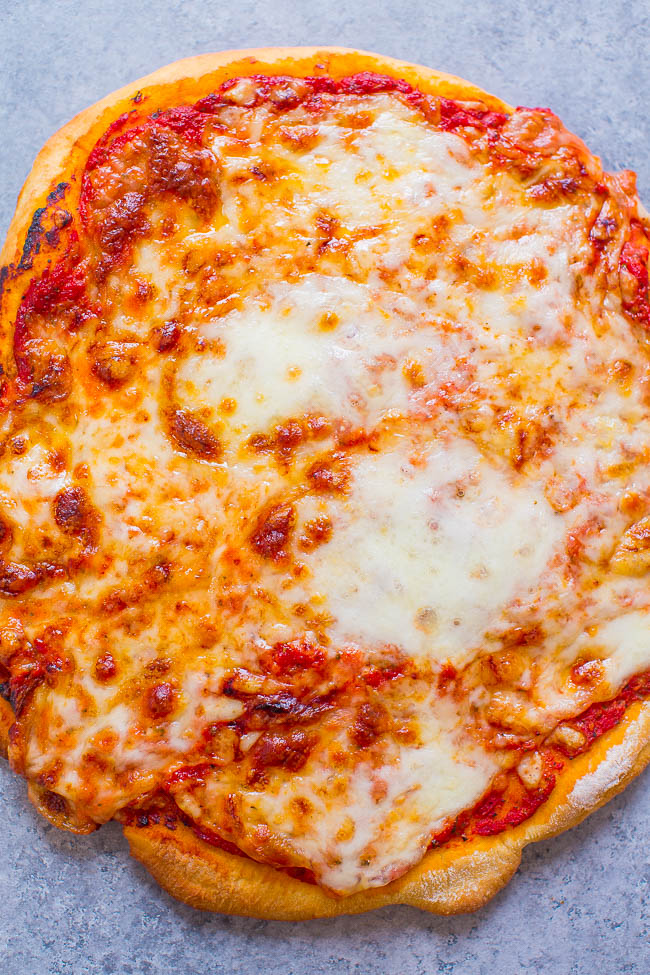Si le sobra pizza de queso, le recomiendo calentarla en el horno a 350 °F durante 10 a 12 minutos, o hasta que el queso comience a burbujear nuevamente. También puedes recalentar la pizza en una sartén seca a fuego medio-alto. Vigile la rebanada, ya que la corteza puede quemarse fácilmente en una sartén caliente.