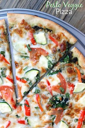 Pesto Veggie Pizza tiene una masa casera (sin cocer) cubierta con salsa de pesto, mozzarella y cualquiera de sus verduras favoritas.