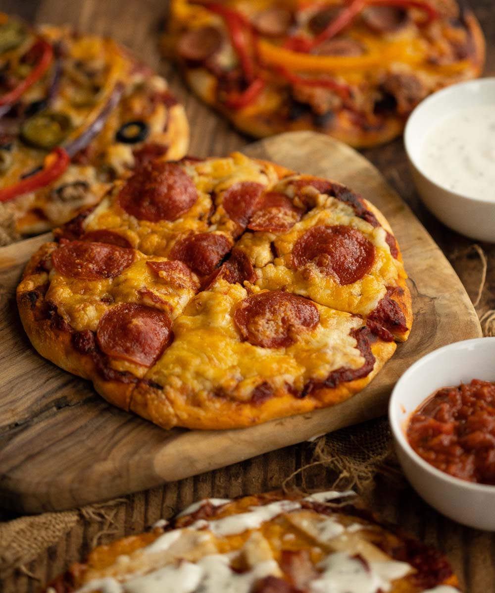 ¡Honestamente puedes ir con lo que quieras! Con esta receta se hacen 4 pizzas pequeñas, esta es la que suelo elegir: