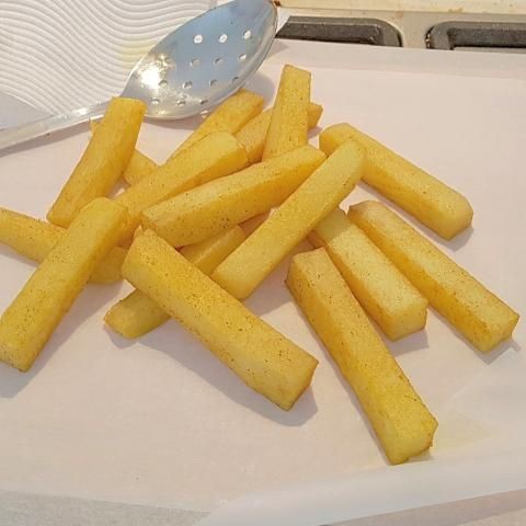 Calienta el aceite en una sart茅n y fr铆e los chips de polenta en grupos hasta que est茅n dorados. Espolvorear con sal y piment贸n.