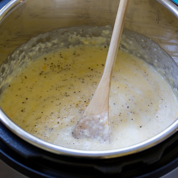 Luego agregue agua, mitad y mitad o leche, sal y mantequilla. Ponga la olla a presión en ALTO durante 10 minutos. Deje que Instant Pot libere la presión de forma natural durante 15 minutos, luego libere manualmente la presión restante antes de quitar la tapa. Agregue un poco de queso cheddar y sus frijoles estarán listos para servir.