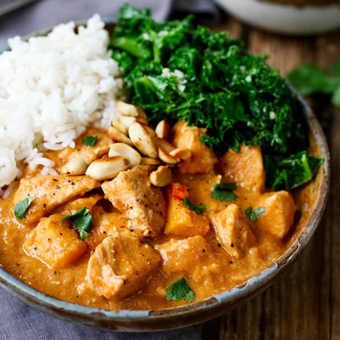 Pollo, especias, mantequilla de maní, batatas y algunas otras golosinas se combinan para hacer una cena sabrosa.
