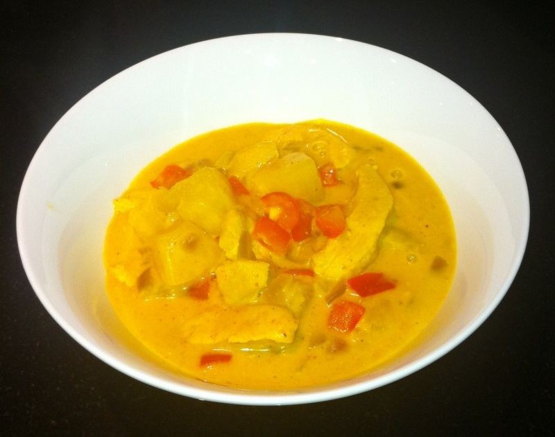 Freír el curry de cebolla y la mantequilla en una sartén grande.
