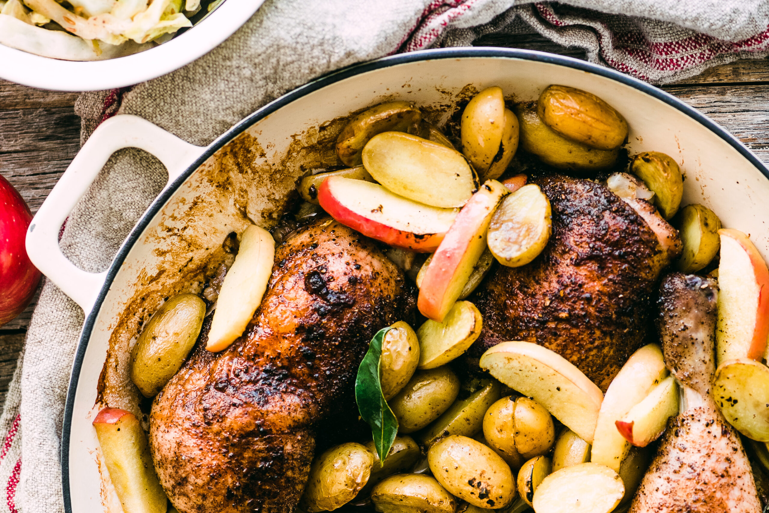 Pollo asado con papas, manzanas y repollo moreno ~ Esta acogedora receta de cena de pollo escandinavo es la mejor comida para disfrutar