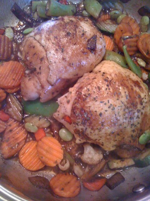 Vierta la mitad de su vinagre balsámico y mezcle más. Mezcla tus toppings uno por uno. (Nota: ¿No hay sal en esta receta? Hay suficiente en el vinagre balsámico). Revuelva un poco más, luego vierta suavemente el resto del vinagre sobre el costado de la sartén, no sobre la comida. Revuelva un poco más y cuando el pollo esté listo, ¡estará bien!