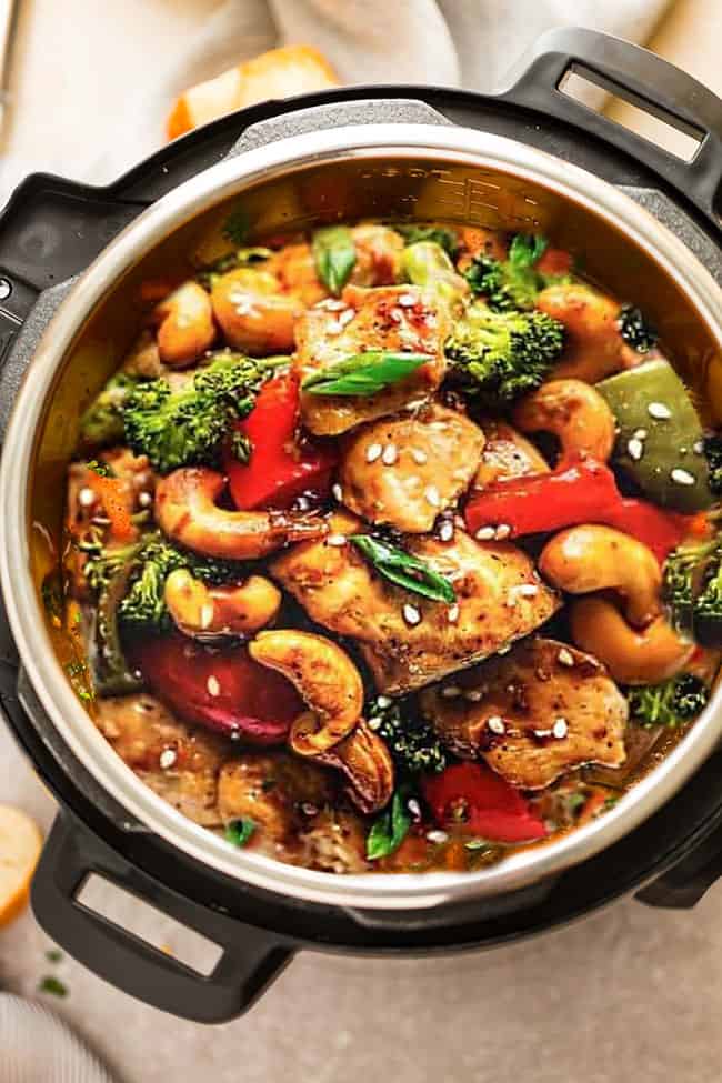 Pollo salteado instantáneo con anacardos – ¡Una popular comida china para llevar que se prepara fácilmente en la olla a presión en menos de 30 minutos! Cena de pollo fácil de personalizar, perfecta para noches llenas de gente.