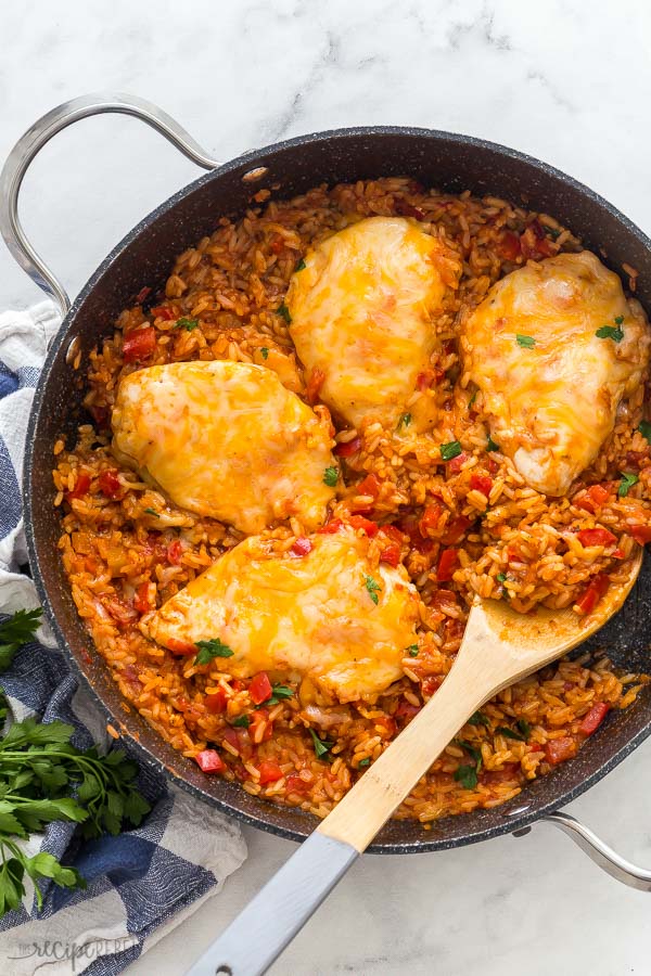 - Destape, mezcle el arroz y espolvoree el queso sobre el pollo. Cubra y deje reposar durante 5 minutos antes de servir.