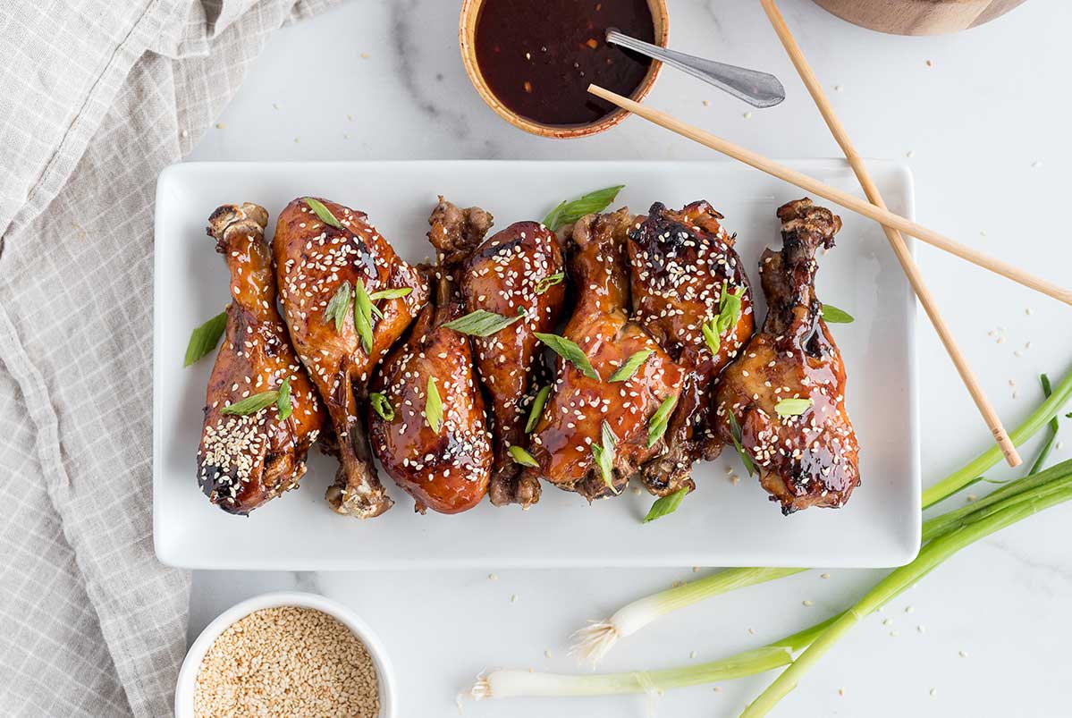 Cepille los muslos con salsa barbacoa coreana. Adorne con semillas de sésamo tostadas y cebollas verdes en rodajas finas.