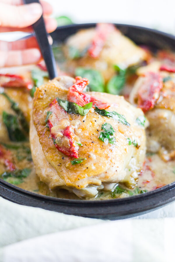 ¡Esta receta cremosa de pollo toscano es la mejor receta para una cena saludable! Está lleno de sabor, pero es ceto (bajo en carbohidratos) y paleo. Prepárelo en una sartén de hierro fundido y póngalo en el horno para una comida sencilla y saludable. Está hecho con ingredientes simples como muslos de pollo, ajo, tomates secados al sol y albahaca.